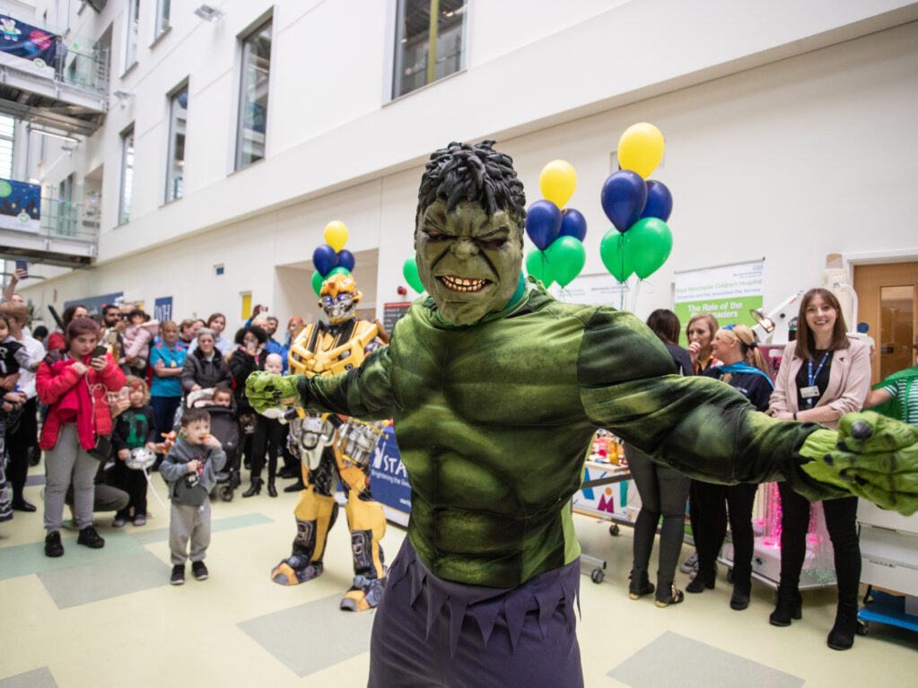 We kicked off the week at Royal Manchester Children’s Hospital with our launch event. Patients and staff gathered in the foyer of the hospital to hear speeches from the RMCH Deputy Director of Nursing, Michele Milner; Susan Fairclough, Therapeutic and Specialised Play Service Manager, and the Chair of the National Association of Health Play Specialists Penelope Hart-Spencer on the importance of play in hospital, before children and families were treated to a magnificent superhero flash-mob!